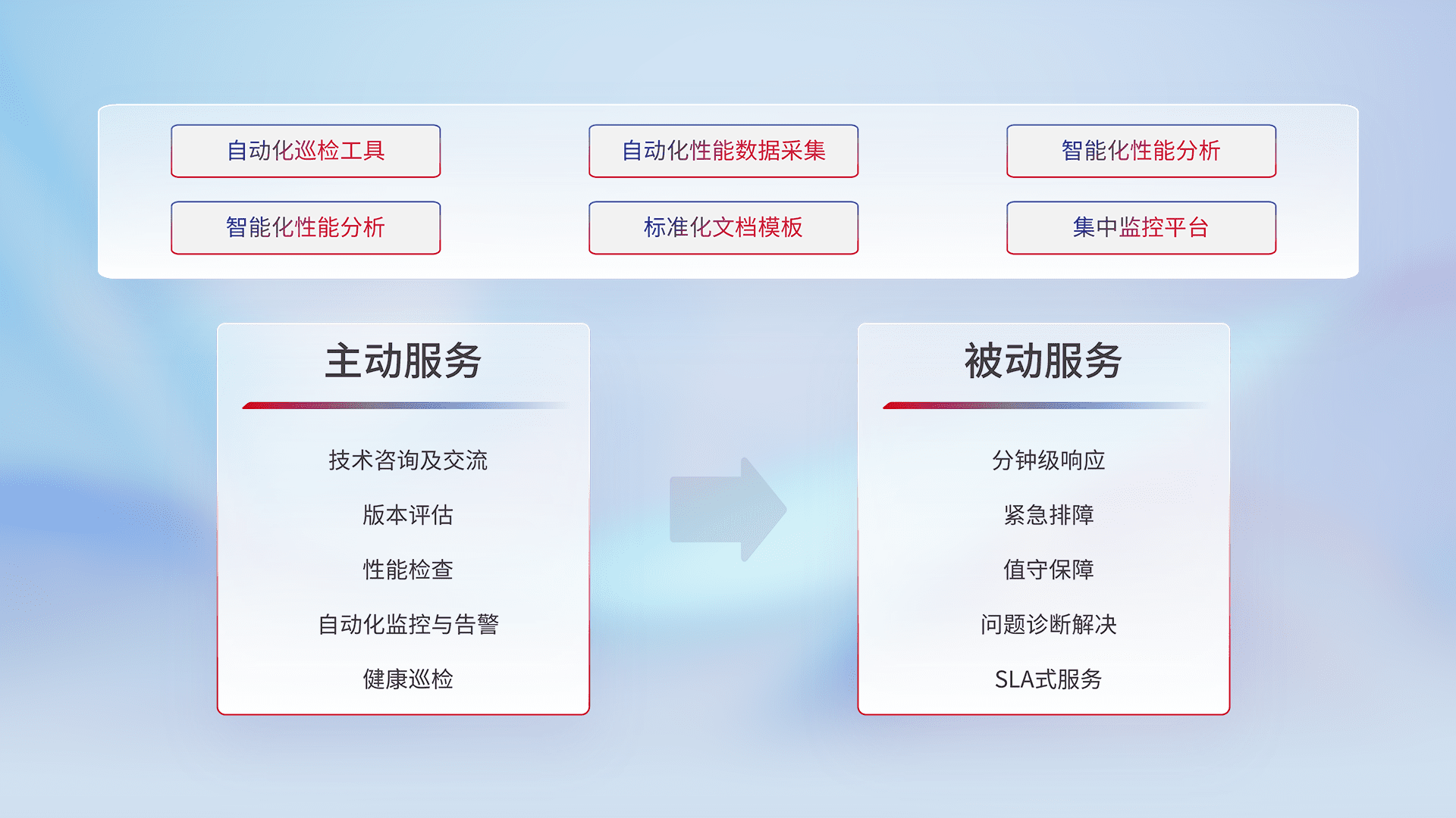 智能化工具和标准化文档,,,保障服务质量,,,,提供主动服务(包含技术咨询、、版本评估、、、、性能检查、、、、自动化监控与告警、、、健康巡检)和被动服务包含(分钟级响应、、紧急排障、、值守保障、、、问题诊断解决、、、、SLA服务)。。。。