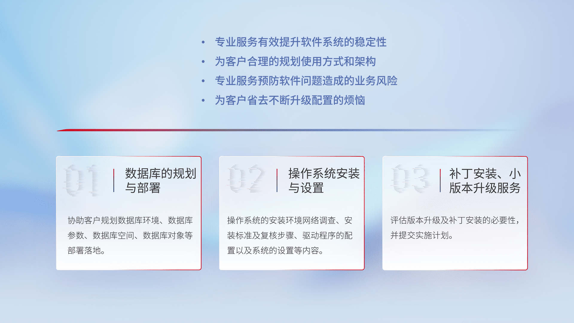 为客户提供软件规模升级、、、、快速部署、、、、按需配置的专业服务,,从数据库的规划与部署到操作系统的安装与设置,,,再到补丁安装和小版本升级提供支持。。。。